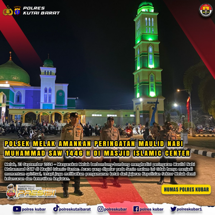 Melak, 23 September 2024 – Masyarakat Melak berbondong-bondong menghadiri peringatan Maulid Nabi Muhammad SAW di Masjid Islamic Center. Acara yang digelar pada Senin malam ini tidak hanya menjadi momentum spiritual, tetapi juga melibatkan pengamanan ketat dari jajaran Kepolisian Sektor Melak demi kelancaran dan ketertiban kegiatan.
